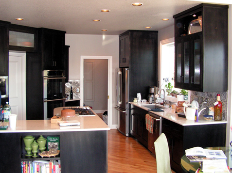 | Glass doors with tight ribbed pattern and Display overhead | Custom shaped island with pullout trays,cookie sheet cupboard, drawers, and bookcase |